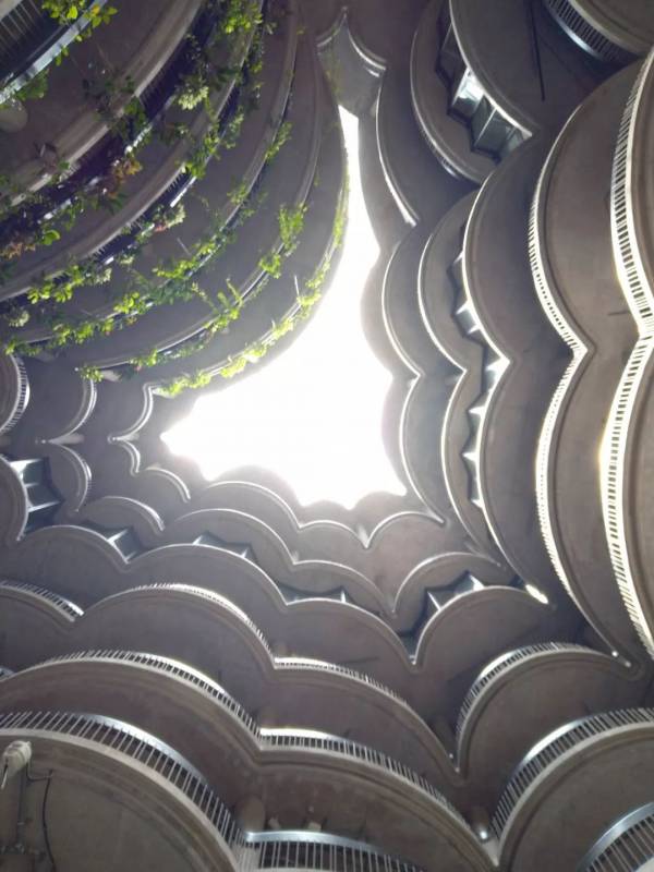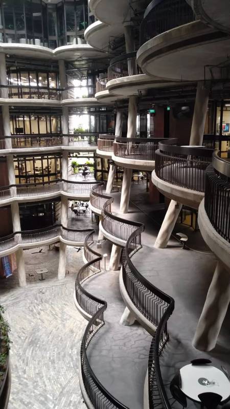 内部层层叠叠的阳台又显得很具有南洋风情。建筑平面非常的放飞自我,有人说像大肠小肠,有人说像单细胞生物。不过从目前来看,室内的有效使用面积还是相对较低的,可能在未来会有扩展改造,把公共空间转换为室内使用空间的考虑吧。