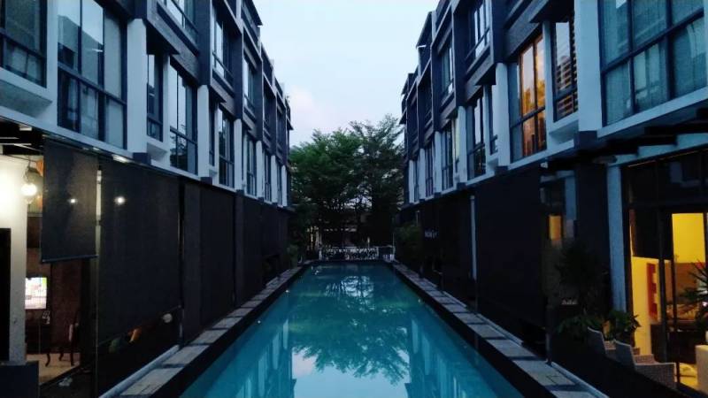 也不知道自己是什么原因就瞎转到了这里,一个比较高品质的联排住宅,建筑风格比较简约。整个住宅的核心是中间的带状泳池,成阶梯布置这几段不同深度的游泳区。只是两侧的住宅隔着泳池相对布置,客厅以及窗户面对面布置,在隐私性上完全失败。导致一层客厅的外面,大家几乎都把窗帘拉上,阻挡了视线,但又有了种莫名肃穆的感。