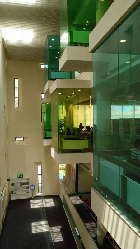 也是一个设计朴素但是有趣的作品,主要的亮点是外面彩色的飘窗以及内部的玻璃体块空间。蓝绿两色的搭配看起来非常清爽,同时突出的体块穿插又为个人或者团体提供了半私密的阅读空间。