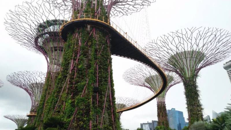 要解释一下是,由于新加坡地处热带,实际上比多数植物的生长环境都要热,所以我们这边的温室到那里就变成冷室。两个冷室的曲线造型与外露的混凝土骨架是一大亮点,虽说有人觉得造型像bra,但我觉得还好,反而是结构的韵律与力量感让人想到了扎哈与卡拉特拉瓦。人造树实质上也是两个冷室的冷却塔,同时利用爬藤植物与科幻造型带来景观功能。上面还有屋顶餐厅与游览步道。