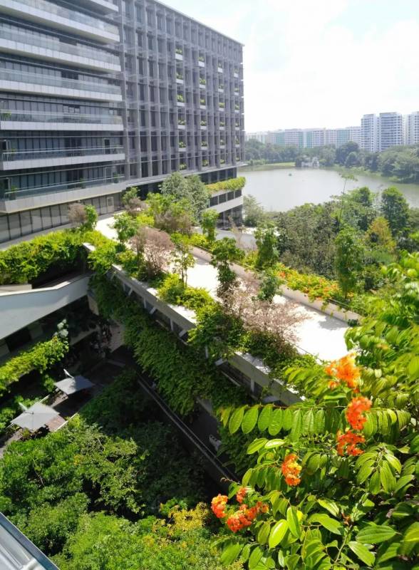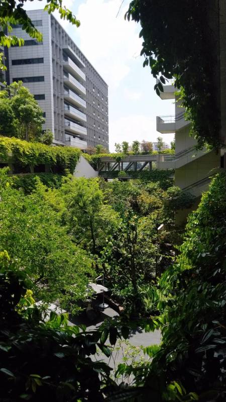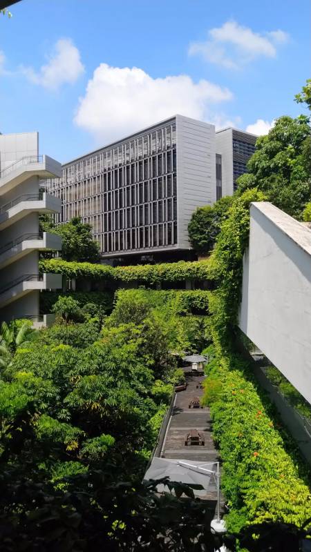 教学楼保持着比较强的新加坡特色,玻璃雨棚下开放的公共活动空间,大面积的阳台以及墙面种植的植物。公共空间的植被数量也令人惊叹。