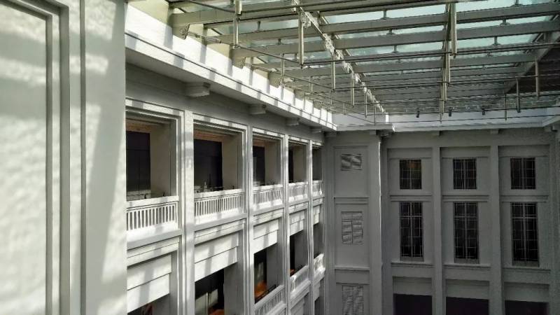 利用独特的树叉状造型柱支撑起整个屋顶,同时穿孔铝板独特造型的阴影投映在古建筑的墙体上,产生出别样的质感,如同在巨大热带树木的树荫之下。屋顶空间被改造为了水景花园,同时增加了餐厅酒吧的功能。而水景所覆蓋着的恰恰是东北侧建筑大厅的玻璃屋顶。水波被投影到建筑的墙面上,为固定的形体带来了运动的效果。西南侧的建筑内部则把树枝状的支撑与原有的穹顶结合,带来别样的建筑视觉感。