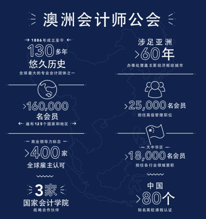 拥有130多年历史的澳洲会计师公会在国际上享有盛誉,会员目前在全球众多大型企业担任各类要职,中国大陆5000多名会员在各个领域均有所建树,包括政府、国有、外资和民营企业、会计师事务所、银行证券等金融领域。