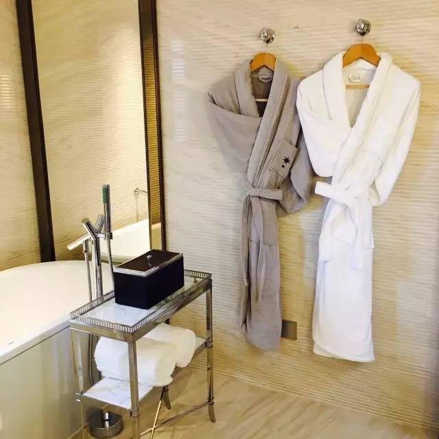 卫生间的设计也很简单,与整体石库门的简约风格相符。上好材料的浴袍和ACQUA的洗漱品,看得出顶级酒店的选品标准。