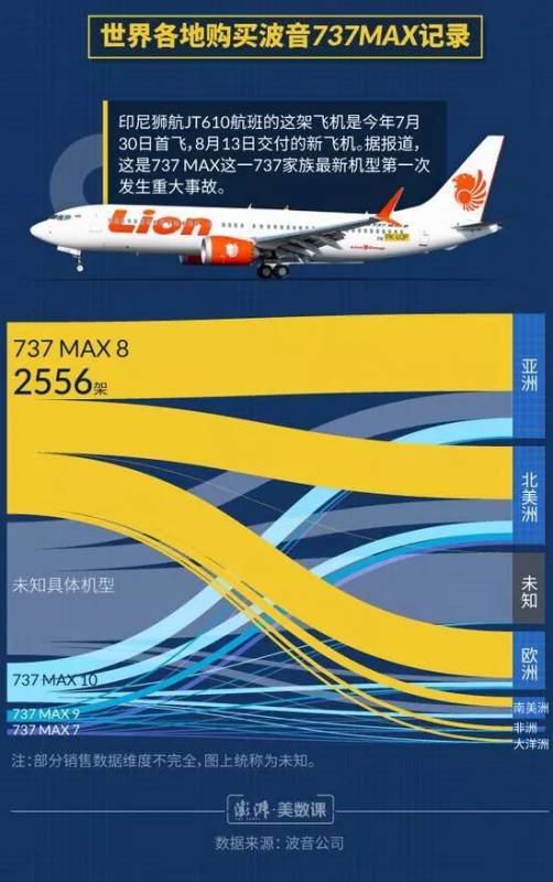据报道,此次坠毁的飞机机型是波音737 MAX 8,为印尼狮航今年7月30日首飞的新飞机。这次的坠机事件,也是737家族最新型号第一次发生重大事故。据波音官网介绍,737 MAX这款飞机是目前全球可靠性最高的飞机,拥有高达99.7%的可靠率,以帮助航空公司保证航班正常运营及减少维修。