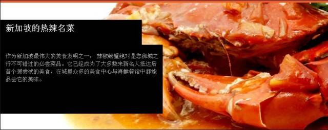 要吃正宗道地的辣椒螃蟹,其中烹饪得最为出色的餐厅有:无招牌海鲜餐馆(No Signboard Seafood Restaurant)、珍宝海鲜楼(Jumbo Seafood)以及东海岸海鲜美食村的长堤海鲜楼(Long Beach Seafood),这些都是您的尝蟹优选。至于其他独具特色的品尝海鲜大餐地点,还包括邓布西山的长堤海鲜楼(Long Beach Seafood at Dempsey)、位于浮尔顿一号(One Fullerton)的棕榈滩海鲜坊(Palm Beach Seafood),以及新加坡圣淘沙名胜世界内的新加坡海鲜共和国(Singapore Seafood Republic)。辣椒螃蟹的最大特色,就是由辣椒和番茄酱料理酱汁,香辣中带着微甜的可口滋味,明快的颜色让您胃口大开,红色鲜香的酱汁散发着带有香蒜与米醋的香味所征服,到最后再加入勾芡与蛋花。