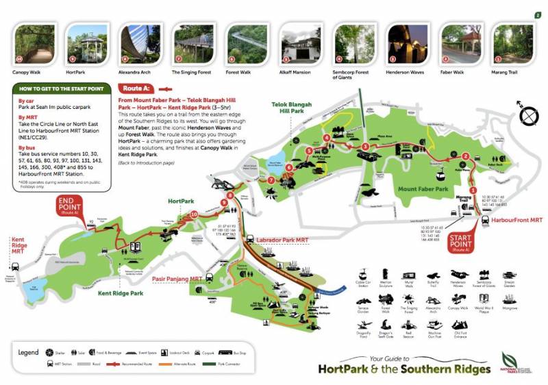 接下来介绍的就是著名的南部山脊徒步路线啦。总长约 10 km的这条路线,会带你穿越四个公园:Mount Faber、Telok Blangah Hill Park、Hort Park和Kent Ridge Park,并且路过新加坡著名的桥梁:Henderson Waves。