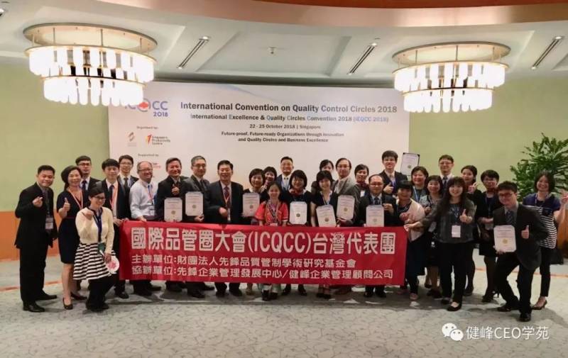 台湾代表团除了全国品管圈总部(PQCRA)之外,尚有统一企业(热线圈)、中龙钢铁(转圈圈)、双和医院(透视圈)、大千医院(3M圈)、台北荣总(齐心圈)、台中荣总(脱离圈)、台中荣总嘉义湾桥分院(三心圈)、高雄荣总(荣重圈)、及高雄荣总台南分院(同心圈),共襄盛举;此次台湾代表团由总团长叶斯水董事长带领,率代表团参与人数共30人、9个发表圈,各圈表现优异,获国际评委一致肯定,均得到“金奖”殊荣,各圈查询发表成绩领受证书时,一片欢腾气氛,令人雀跃!台中荣总嘉义湾桥分院三心圈的发表,并获得“国家最佳奖”,实至名归!