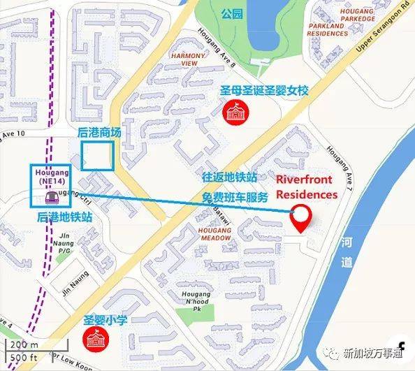Riverfront Residences距离后港地铁站约780米,后港商场约680米。步行15分钟可达,开车只需要3分钟车程。小区提供免费班车往返地铁站。