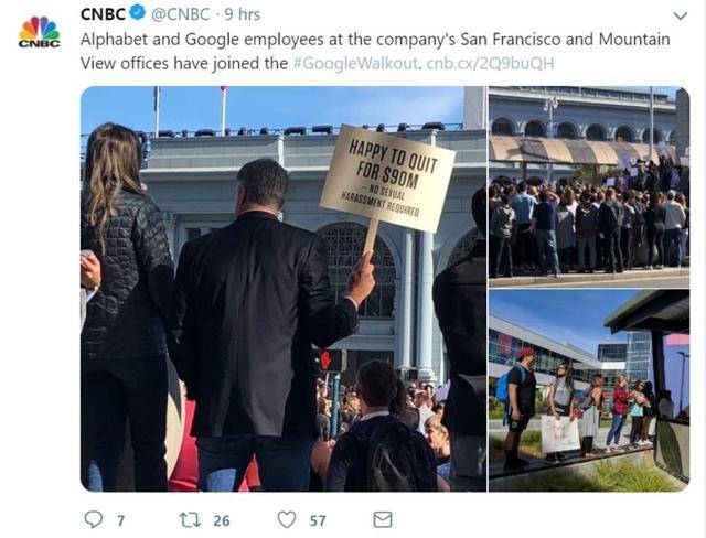 最大的投票事件则发生在加利福尼亚州山景城的谷歌总部。数千名员工聚集在户外区域,上面写着“不要做坏事,保护受害者,不要骚扰”等。许多员工在校园外游行,吟唱“站起来!反击!“目前还不清楚他们是否重返工作岗位。