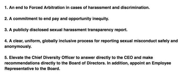 实际上,这场罢工不仅仅是喊口号,谷歌员工还对公司管理层提出了多条建议和要求。