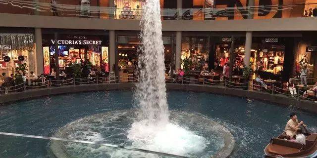 除了豪华之外,最独特的地方就是在室内引入了流水系统,用水池、水道贯穿了整个购物中心,形成了独特的景观。你还可以选择乘船,坐在摇晃的小舟上慢悠悠地游览这个华丽的商场。