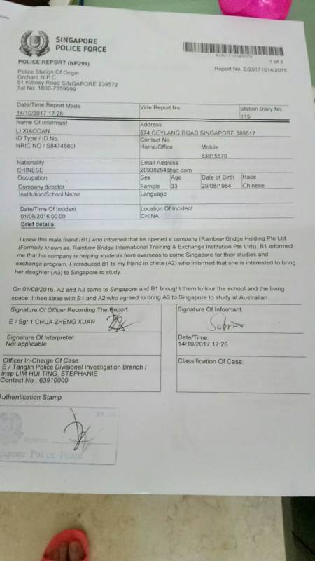事情发生在2016年8月份,新加坡PR李某丹Li Xiaodan一如往常一样把身边的亲戚朋友推荐到新加坡来读书。