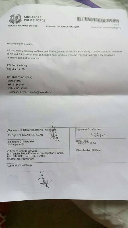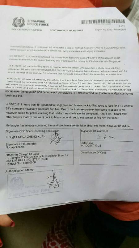 发了多封律师函也没用,于是2017年10月14日李某丹与律师Low Wai Cheong去ORCHARD NEIGHBOURHOOD POLICE CENTRE警察局报警,可是警察说钱是中国汇给钱元昇的,新加坡警察也没办法处理,他们也只会去调查一下情况。