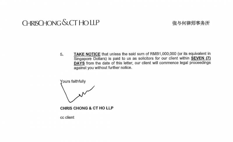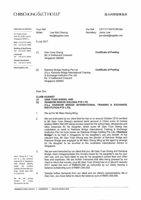 于是李某丹在2017年7月委托张与何律师事务Chris Chong & CT Ho LLP律师Low Wai Cheong所向钱某昇提起诉讼,发出律师函,三封律师函送到钱某昇家里。