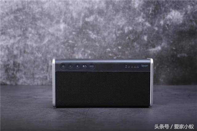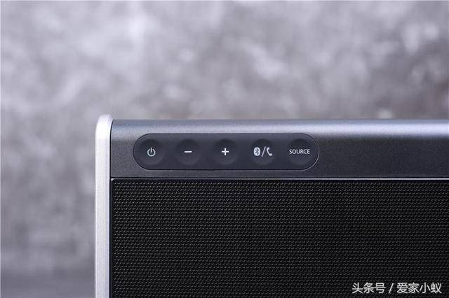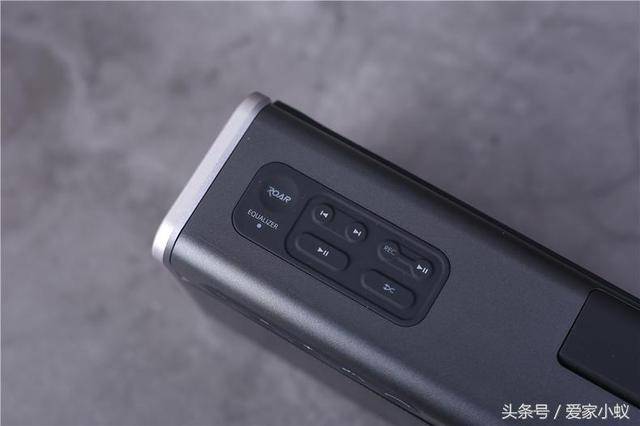 丰富的功能拓展带给iRoar Go另一大特色,控制按钮也是特别的多,正面是常用的控制按键区,分别是电源开关、音量加减、蓝牙/电话接听和输入源切换按键,其中电源按键和蓝牙按键还有背光指示灯设计,与右侧6个指示灯形成一一对应关系。顶部为多媒体控制区,可实现控制曲目上下曲、播放、暂停等功能,顶部左侧的Roar按钮是创新的“锣吼”音效开关,除了开启锣吼音效之外,还能够在均衡器模式以及音效关闭之间进行切换,均衡器模式初始的设定即是超宽音效模式。
