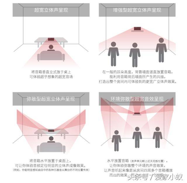 具体一点来说,SuperWideE超宽音效技术4种不同摆放方式带来的效果差异可以分为:1、超宽立体声成像,将音箱垂直立式放于桌上可体验超乎想像的超宽音场;2、增强型超宽立体声成像,在一般的耳朵高度,背靠墙面竖直放置音箱,能利用音箱背后墙面所产生的共振,打造出一个在整个房间内都可体验到的更宽广立体声效果。3、弥散型超宽立体声成像,将音箱水平放置于桌面上可让你体验音频定位明显的立体声成像效果。例如,你能明显感知曲目中的各种乐器音从舞台的不同位置传来。4、环境弥散型超宽音效,水平放置音箱(发声单元朝上)于接近天花板的位置,让你体验弥散整个环境的声音效果,让声音听起来像是从房间四周多个音箱播放而出的效果,而非出自于一个音箱。