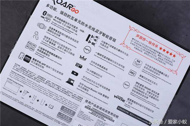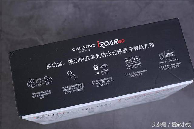 另外,包装上红点设计奖标志也是iRoar Go一大亮点,凭借出色的设计,iRoar Go曾荣获2016年德国红点设计大奖。包装盒子侧面印有iRoar Go多项特性:塞进了多达5个扬声器单元、可接驳麦克风成为扩音器、支持多种音源输入、TF直插支持Flac、MP3等格式播放、支持SoundBlasterConnect APP等等。
