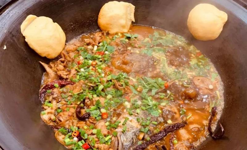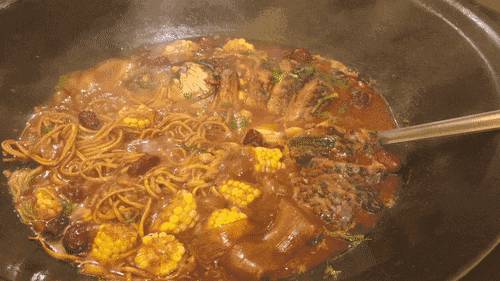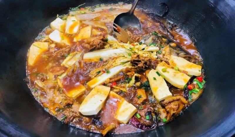 铁锅架在桌子上,下面烧着柴火,想吃的肉、菜、粉、豆腐、玉米……统统放进去;锅延儿上贴一圈“玉米面贴饼子”伴着滚滚浓汤,享受热乎乎的入味儿美食,那叫一个香!
