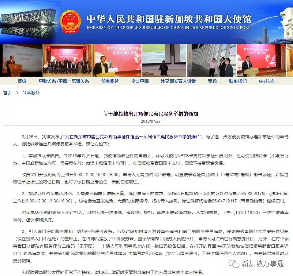 2018年7月27日,为了进一步方便到使馆办理领事证件的申请人,使馆继续推出几项便民服务举措:增加银联卡收费、增加证件咨询电话线路、引入窗口评价服务器和二维码扫码评价设备、试行公证预审服务等。(详情点击:暖心了中国驻新加坡大使馆,又推出一波新措施~)
