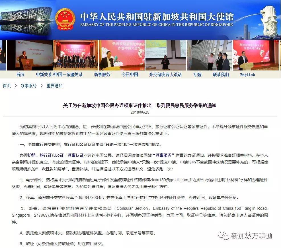 2018年6月25日,中国驻新加坡大使馆发布了《为在新加坡中国公民办理领事证件推出一系列便民惠民服务举措的通知》。(详情点击:重磅:中国驻新加坡大使馆推出超多新服务!)