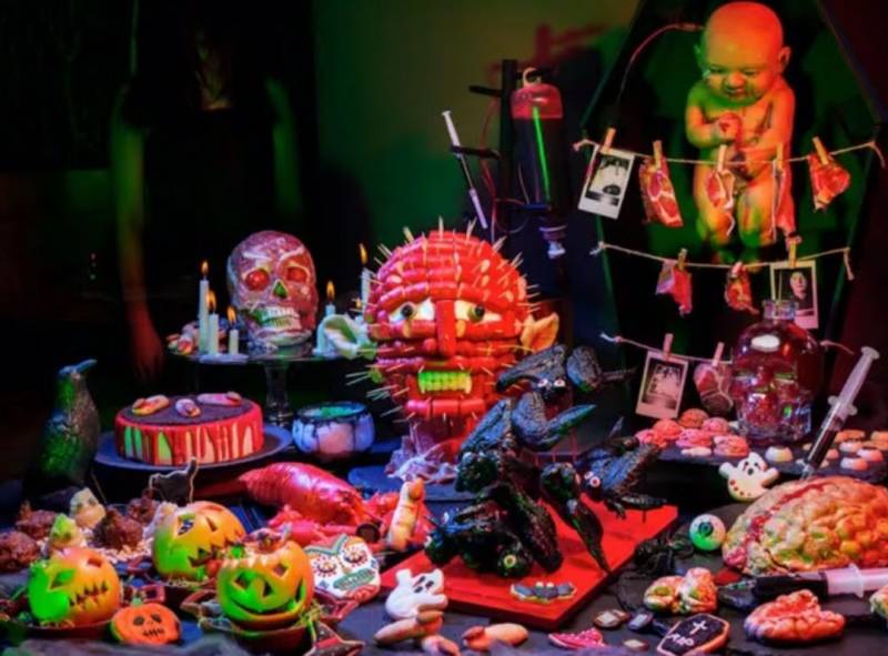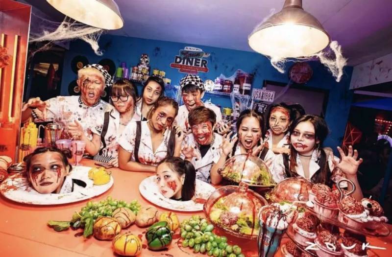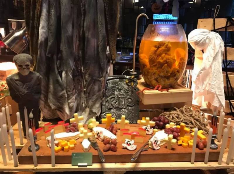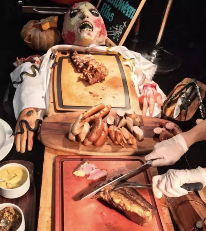 在这家自助餐厅里,特别推出了万圣节特别活动。食物全部被特制成万圣节主题,包括“爱因斯坦的大脑”(鹅肝),“魔鬼的舌头”等等。