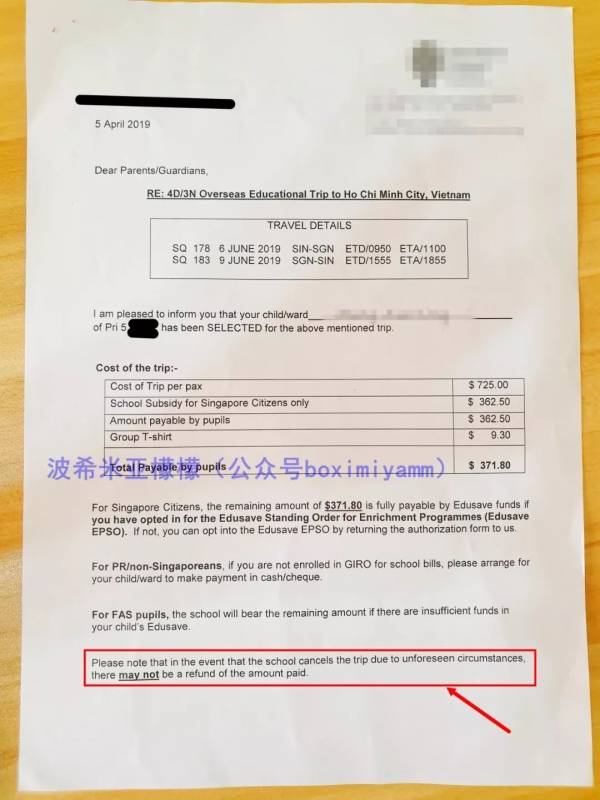 以我家小象为例,越南四天三夜游,全额费用725新币,政府补贴362.5新币(仅限新加坡公民),余款371.8新币使用Edusave教育基金(也是政府每年给的,今年还额外多给了)支付。需要注意的是,如果不能成行,可能无法全额退款。