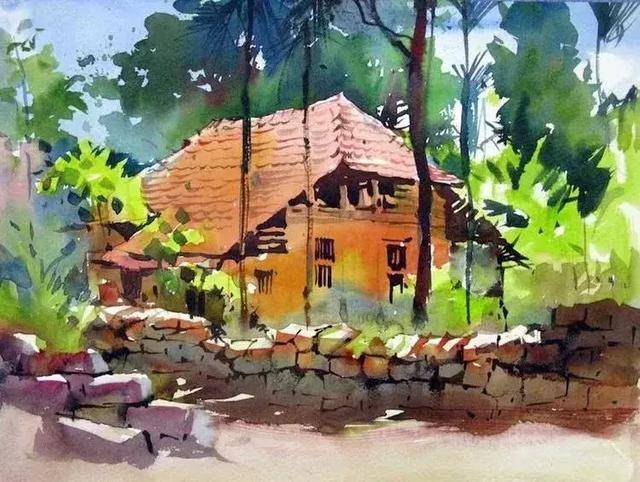图为印度水彩画家Milind Mulick笔下的印度乡村建筑