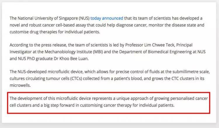 新加坡国立大学科研人员开发的微流体装置可以简单抽血进行活检免除病患痛苦,还能同时测试两种以上的药物消灭癌细胞的疗效等。
