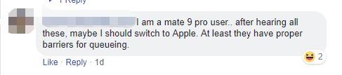 (翻译:我是用Mate 9 Pro的,看完这些留言,我还是换回苹果。因为他们的排队管理更有门槛~)
