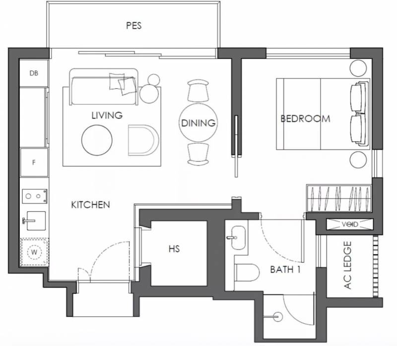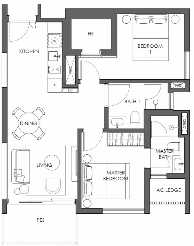 特点是户型方方正正,布局合理,采用开放式厨房,无浪费空间,并拥有额外储物间。客厅和餐厅共享阳台。这样的户型非常适合夫妻情侣享受二人世界,以及专业人士和学生,也适合出租给高端专业人士。