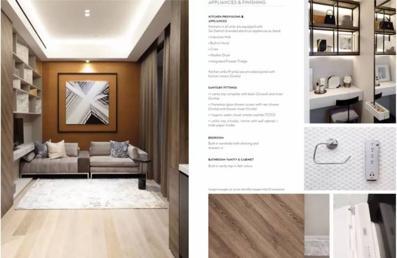 10号伊芙琳公寓是发展商和设计师精心打造的、位于黄金地段的现代豪宅。项目由4栋5层楼高建筑组成一个绿色庭院,项目强调现代与传统的有机结合,崇尚自然、简约、绿意葱葱的乡村景观,同时采用品牌豪华产品打造。所有单位的厨房都配备了De Dietrich品牌电器如自动点火煤气灶、内置通风橱、烤箱、烘干机、冷冻冰箱、厨房水槽(Franke)和与之配对的厨房龙头(Grohe)。卫生间均配备1个梳妆台、洗脸盆(Duravit)和搅拌器(Mixer,Geohe)、1个带淋浴的无框玻璃淋浴屏(Grohe)和淋浴龙头(Grohe)、1个具遥控功能的抽水马桶(TOTO)等。而卧室内将配备内置衣柜等。