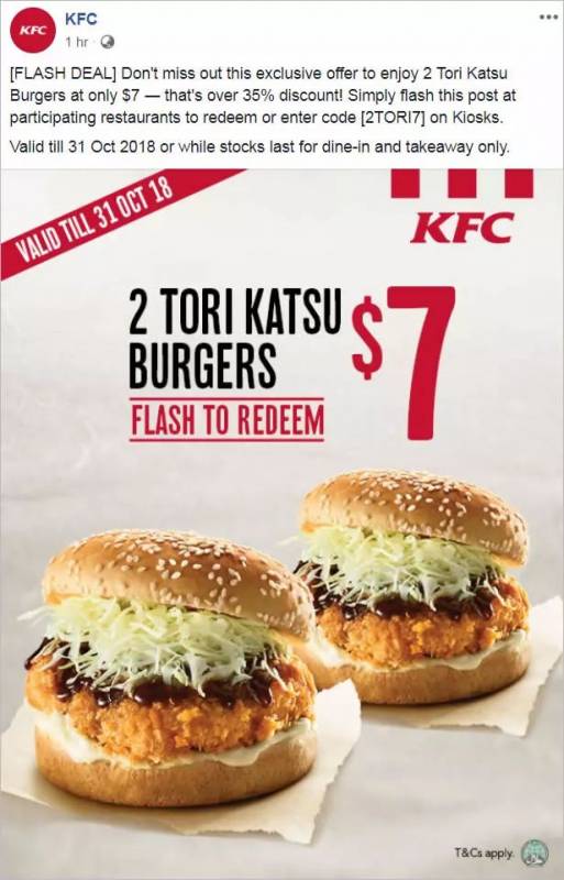 出示此图片,即可享受购买两个Tori Katsu鸡排汉堡只需$7的优惠!