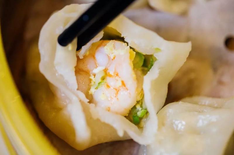 虾仁鸡蛋的蒸饺里面有很大的一只虾仁,还点缀著一种叫西葫芦的瓜,十分诱人