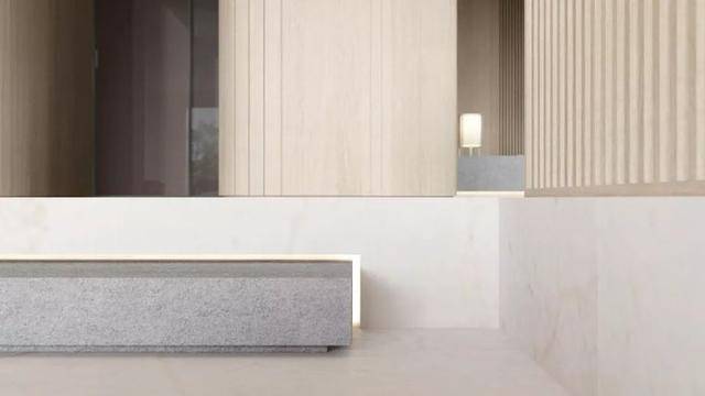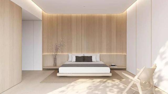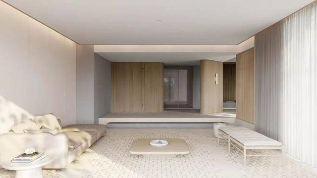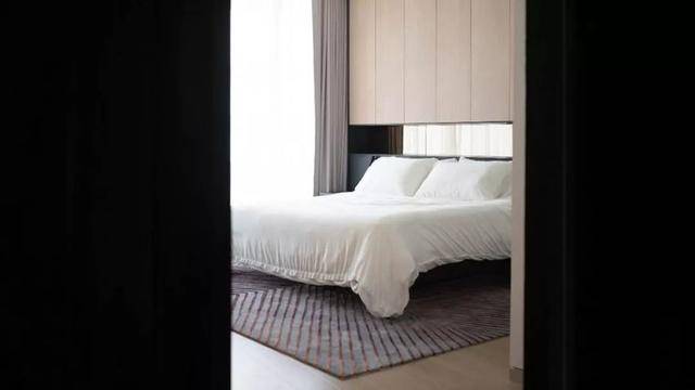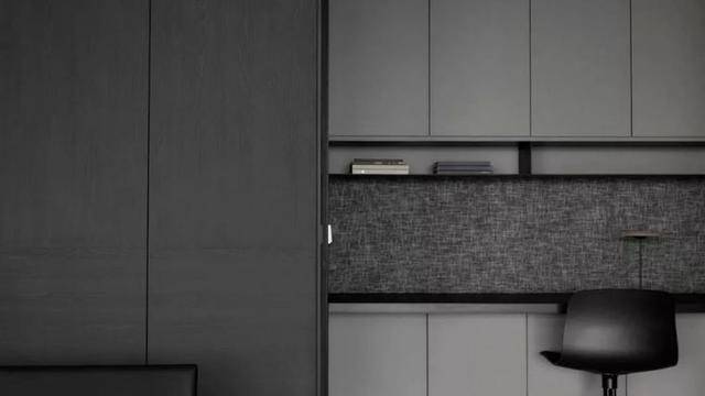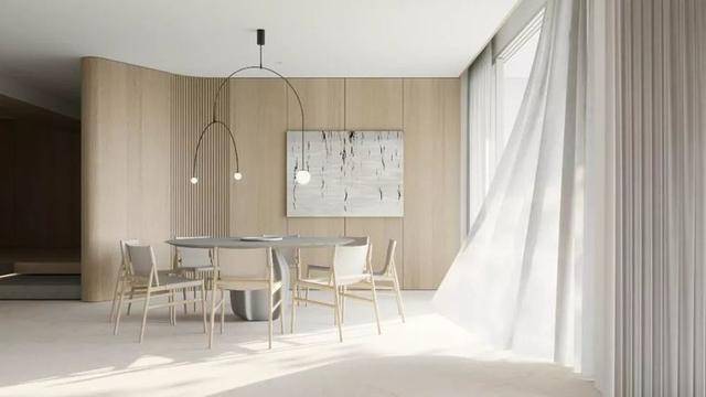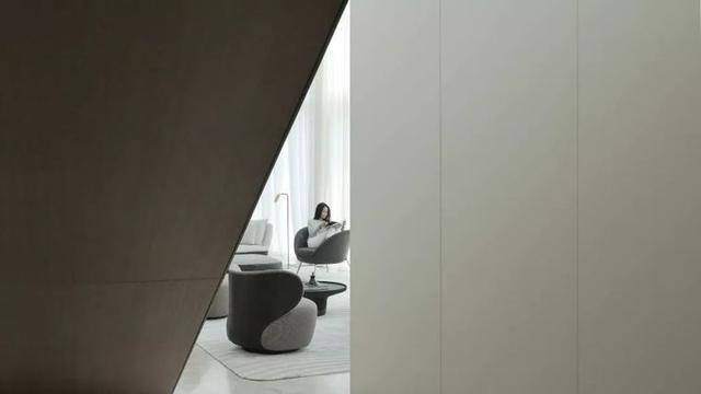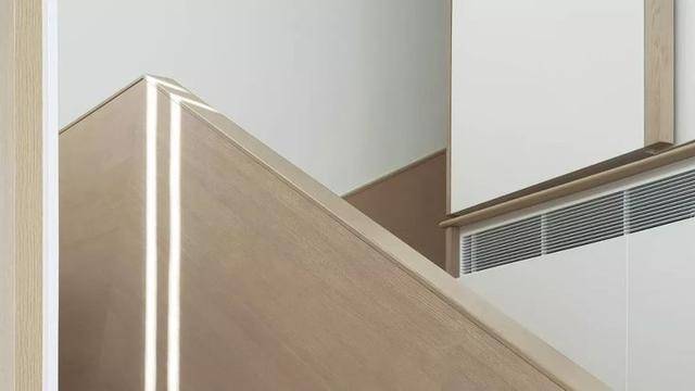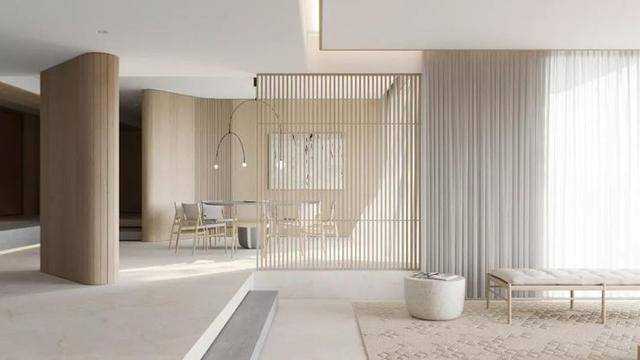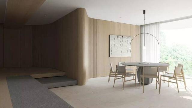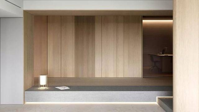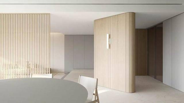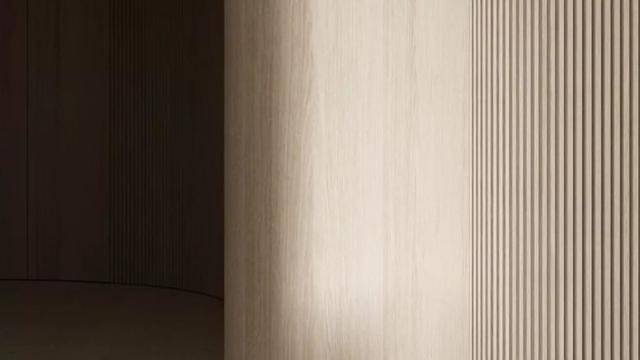 现有的墙面由哑光的天然橡木单板和灰白色高质量的哑光层压板组成,蜿蜒贯穿整个单元,以增强流动性和平滑的弧度。木材门无缝地隐藏在蜿蜒的墙板之间。在空间的中心位置有对角线柱,以圆润的自然橡木饰面,给空间一个重点。简单的奢侈。