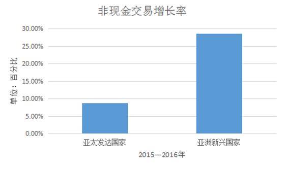 近年来,移动设备上出现了电子钱包等数字支付,这在亚洲最为明显。从2015年到2016年,亚太发达国家的非现金交易增长了8.8%,而亚洲新兴国家的非现金交易增长了28.6%。亚洲的数字支付预计将以每年16.4%的速度增长,到2022年将达到每年2.5万亿美元。这几乎是全世界预估的数字支付总额5.4万亿美元的一半。