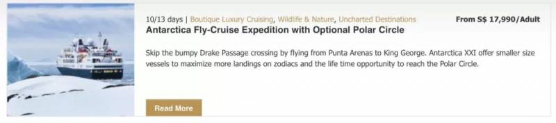 随便上网一搜,新加坡去南极的旅行大约要花17990新币(约9万人民币),要是去到南纬90度的南极点,就要119990新币(约60万人民币)!当然,这还不包括机票钱......