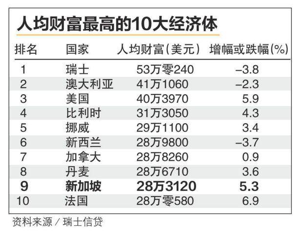 就在5天前,瑞士信贷研究院(Credit Suisse Research Institute)发布了2018全球财富报告,新加坡个人财富超越香港成为亚洲第一,全球第九!新加坡人的整体财富增加7.4%至1.3万亿美元(约1.8万亿新元)。每名成年人的财富增加5.3%至28万3000美元以上,全球排名第九。瑞士信贷研究院也发布,在未来五年内,新加坡人的财富每年预计增长4.6%,到了2023年达到1.6万亿美元。