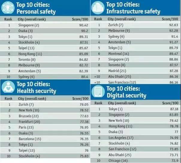 安全分类中,新加坡的人身安全(Personal Safety)位列全球第一。基础建设安全位列第七,数据安全位列世界第二。相比之下,卫生系统安全则比较落后,没有进入前十。