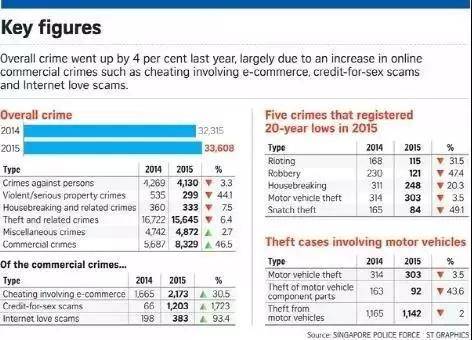 上图是新加坡警察局公布的2014和2015年犯罪记录详情。你可以看到,2015年和2014年相比,犯罪率上升比较明显的是商业犯罪(Commercial Crimes),主要以网上犯罪和欺骗性性交易为主。偷盗,抢劫等犯罪都有下降。