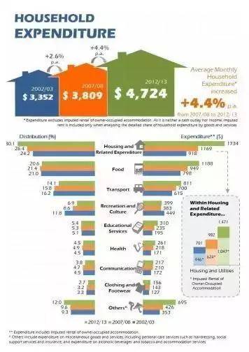 上图是新加坡政府于2012/13年做过的一次调查总结。你可以看到,每个家庭月平均支出大约在4,700新币左右(约合人民币23,000元),主要用于房租/水电,食物和交通等。