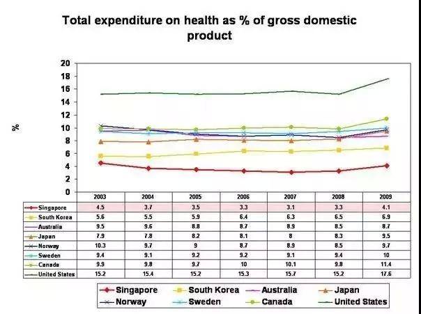 在上图中你可以看到,新加坡政府对于医疗的开支占GDP的比重比其他发达国家都要低很多。相比之下,美国是一个相反的例子,花了很多钱,但还有很多人不满意。新加坡政府是螺蛳壳里做道场,非常精打细算,在开支方面很谨慎。当然,这也引起了一些人的不满,觉得一个发达国家却没有免费医疗,其福利不及澳大利亚和加拿大等发达国家。