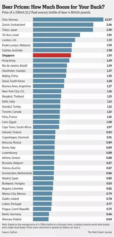 之前我说过,新加坡的烟和酒是被政府课以重税的,因此烟酒的价格非常高。比如上图显示,新加坡的啤酒价格在世界上属于最高之一。