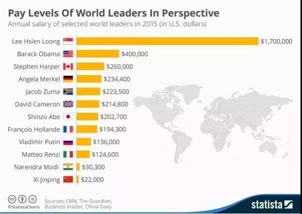 在上面两张图中你可以看到,新加坡总理李显龙的年薪(在2011年降薪之后,1.7百万美元)是全世界最高的。美国总统奥巴马的年薪为40万美元。新加坡的高级公务员不光总理薪水高,下面的一些部长也很高。比如市长级别的公务员(Mayor)年薪为66万新币(大约合人民币330万)。当然,有一点需要指出,即新加坡的公务员收入仅限于看得到的薪水,而没有其他福利(比如房贴,车贴,教育津贴等等)。新加坡政府的逻辑是与其给一个低薪水,外配其他一些比较不透明的福利,还不如给一个透明的大家都看得到的高薪水,这样在讨论其薪水水平,并和其他行业进行比较时也比较方便。