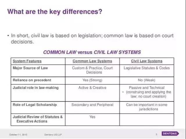 Common Law和Civil Law最大的区别在于,Common Law遵循的是以前判过的案例,而Civil Law遵循的是立法。过去法庭判过的案例(无论对错)在Common Law下面,对于现在的审判的影响要大于Civil Law。陪审团在Common Law的框架下对最后判决意见的影响力更大。