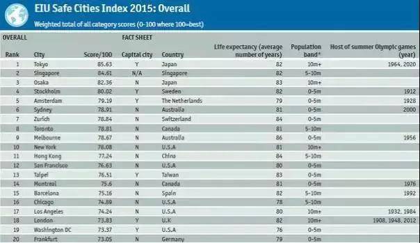 据经济学家杂志(Economist)在2015年的一项研究得出的世界最安全城市排名中,新加坡位列第二,仅次于东京。