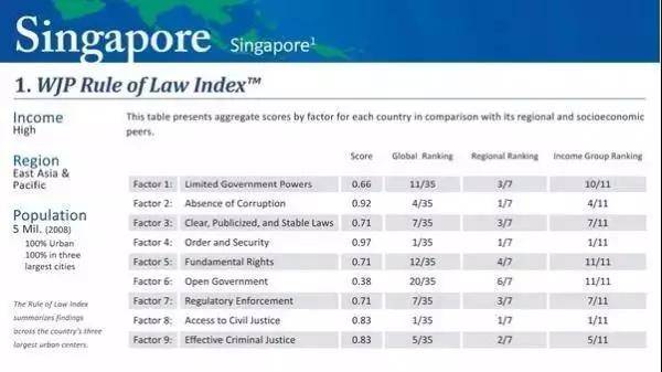 那么新加坡的法律环境在全世界来讲属于什么程度呢?上面的Rule of Law Index可以给出一些信息。你可以看到,新加坡在全球法治指数中排名第十,在亚太地区仅次于澳大利亚。