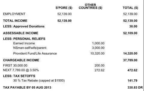 刚刚在上文中我提到,新加坡的个人所得税并不是简单的基于年收入(比如薪水),因为会有一些税收抵扣。比如上图中是一位工薪阶层的纳税单(2013年)。你可以看到他的年收入为5万2千新币(约合人民币25万元),在扣除了一些抵扣后(比如公积金CPF等),他需要上缴的年收入为3万7千新币,需要缴的税为330新币,实际税率为0.6%。