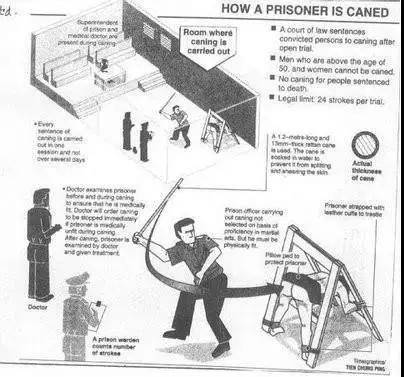 不过虽然死刑少,新加坡可是有鞭刑的。上图中给了一个鞭刑的例子,各位看官自己体会一下其中的痛苦吧。鞭刑一般被适用于比较严重的犯罪,比如强奸,抢劫等。