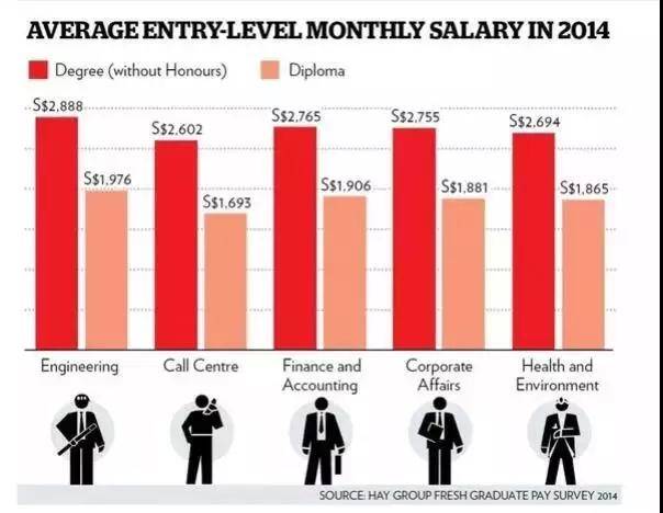 说说刚从学校毕业的学生的起薪。从上图中你可以看到,如果拥有大学本科学历,那么起薪一般在每个月2700-2800新币左右(约合人民币13000左右)。如果是大专学历,那么起薪在1800-2000新币左右。有一些特殊专业(法律和医科)的起薪会特别高,因为这两个专业在新加坡非常吃香,供不应求。